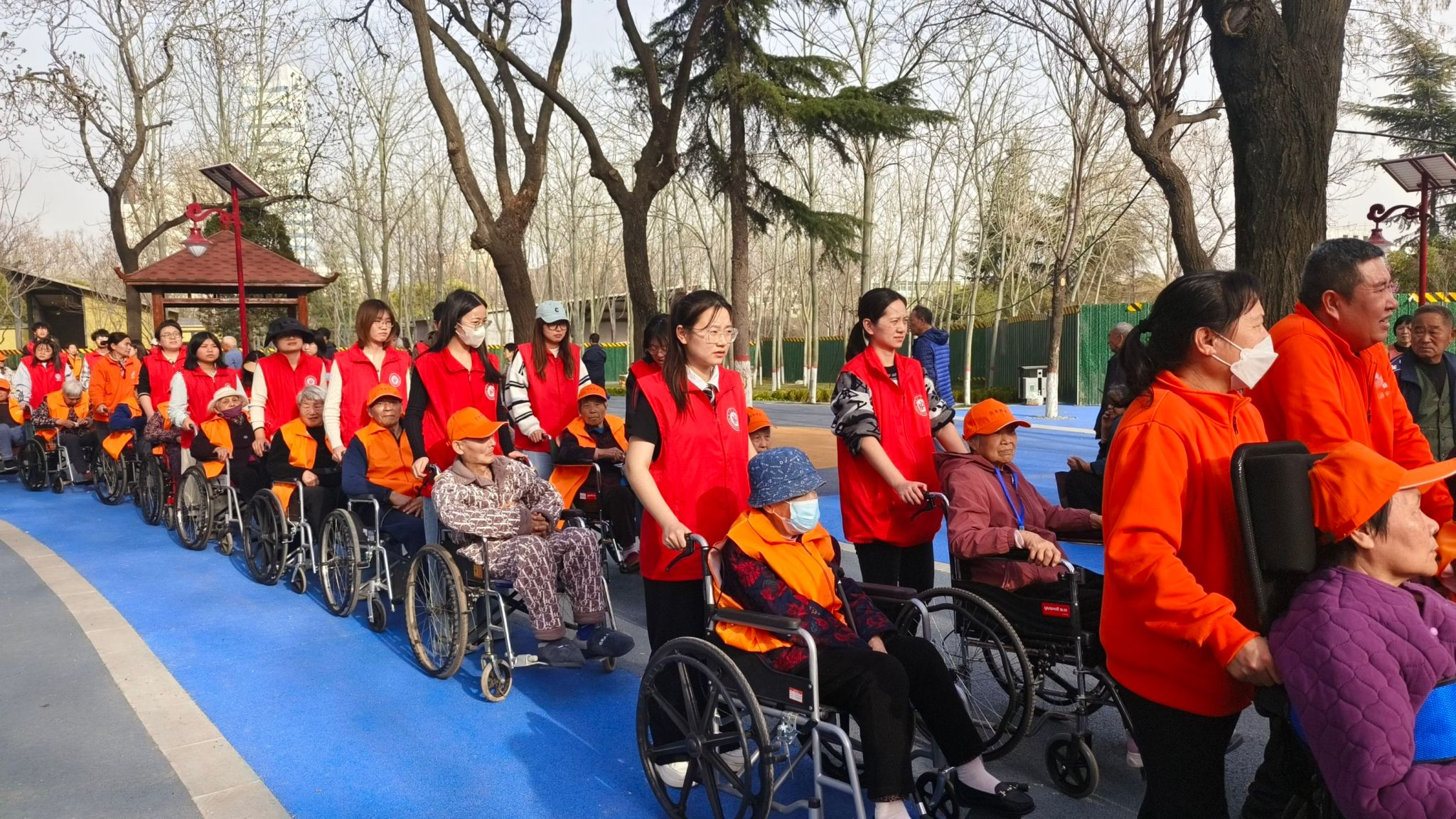 随后,师生们推着轮椅,32位老人有序地被带往公园,开启了一场意义非凡的春游之旅。一到公园,安泰之家的护工们在临时搭建的小舞台上,一曲曲经典的戏曲选段悠扬响起,老人们听得如痴如醉,不时跟着哼唱,脸上洋溢着幸福的笑容。戏曲表演结束后,是自由活动时间,师生们陪伴在老人身边,或推着轮椅漫步于花间小径,或坐在长椅上倾听老人讲述过去的故事,空气中弥漫着温馨与和谐。