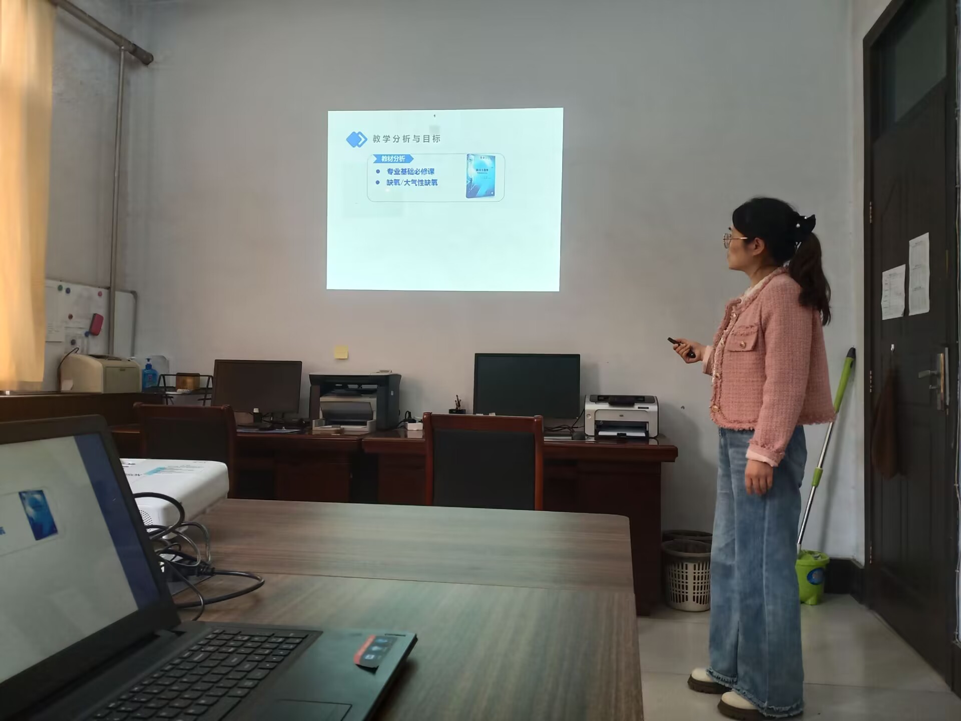 会议首先由校级思政样板课程《病理生理学》的任课教师侯欣欣分享了她将思政教育融入课堂的方法。侯老师用说课的形式以“大气性缺氧”内容为例讲述了她的整个教学设计及教学方法,并且重点阐述了她的思政融入环节,主要是将理论内容结合实时案例有机地融入了思政内容,引导学生树立救死扶伤、坚守岗位的职业精神。给老师们提供了思政融入课堂的思路和方法。