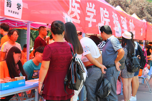 随着迎新车辆的来往出入,新生及其家长陆续抵达学校,迎新现场到处洋溢着喜悦的气氛。迎新工作人员身着统一鲜艳的服装,热情的接待每一位新生,帮助新生领取钥匙找到宿舍安置行李,及时安排座位供家长休息,然后带领新生完成注册一系列手续。迎新现场,各流程分工明确,细致周到,大家相互沟通交流,极大的提升了工作效率。还有早几天就来报到的新生也积极参与到迎新工作中,挥洒着汗水,俨然一副热情好客的小主人姿态。在迎新现场随处可见她们忙碌的身影。一张张照片记录下新成员融入医学院大家庭的美好瞬间,以及学生会成员的热情服务状态。他们时而微笑着解答新生的问题;时而热络的介绍着学校情况;时而在注册处捧着资料,仔细核查学生信息;时而耐心的与新生沟通。他们累并快乐着,他们坚守岗位要学弟学妹开心,他们努力付出要新生家长放心。