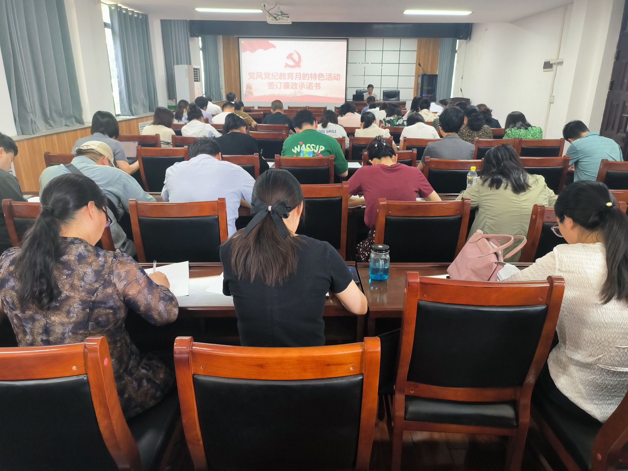 随后,为加强廉政建设,提高党员干部的廉洁自律意识,会议安排了一项特殊环节——学院党员扫二维码签署廉政承诺书。这一举措不仅创新了教育方式,也进一步强化了党员干部的责任担当,使每一位党员都深刻认识到自己在廉政建设中的重要作用。