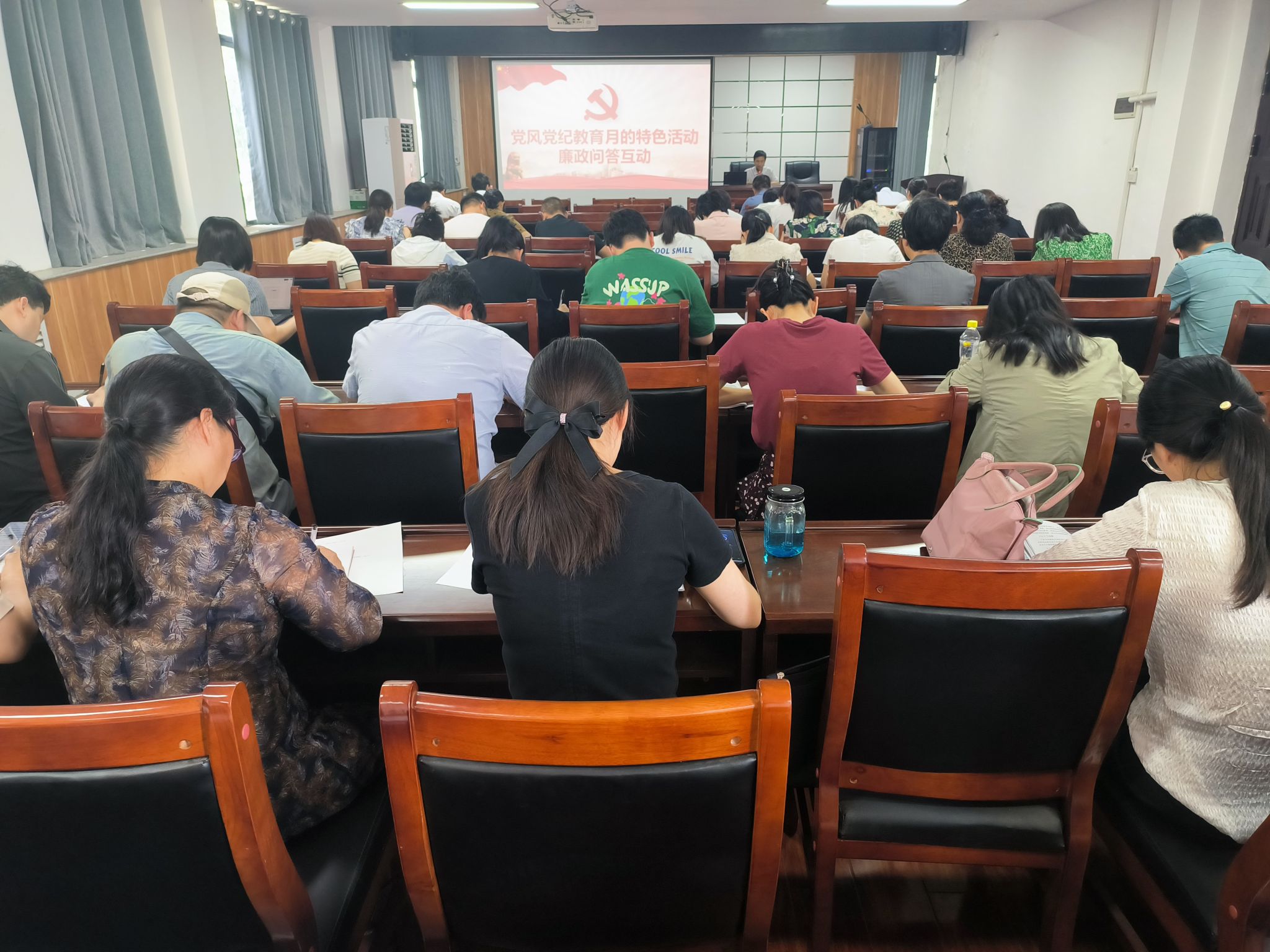 此外,为了检验党员干部对廉政知识的掌握情况,提高廉政教育的针对性和实效性,会议还安排了廉政知识问答活动。党员们通过扫描二维码参与问答,既增加了学习的趣味性,也促进了廉政知识的普及和深入。