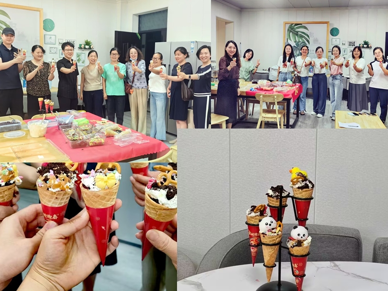 “热奶宝创意工坊”环节,工会备齐糯米、血糯米、奶油、蛋筒等食材。教职工们大展身手,蒸糯米、打发奶油、装饰搭配,现场欢声笑语不断。