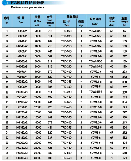 本系列风机结构形式分A型、B型、HG型三种,即电机安装在箱体内的为A型(A型为通风型);电机安装在箱体外的为B型(B型为消防型);外转子电机的风机箱为HG型。其中A型和B型的同一机号按不同的性能参数又分为Ⅰ型和Ⅱ型。此类风机可应用于宾馆、饭店、礼堂、地下室、厂矿企业的车间、办公室等多种需要消防并通风换气的场所,用户可根据不同使用场合和不同用途作不同的选择。