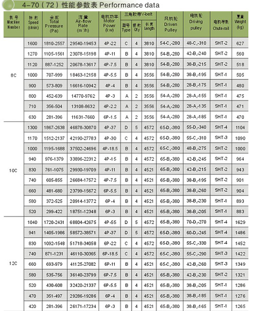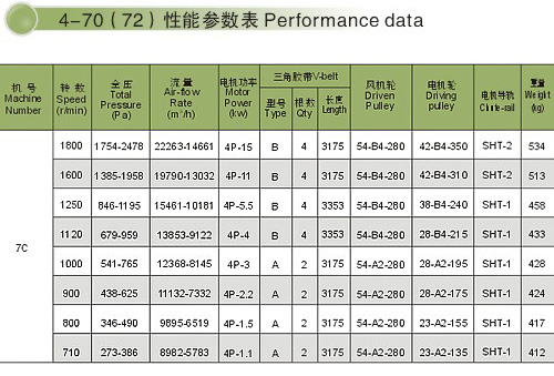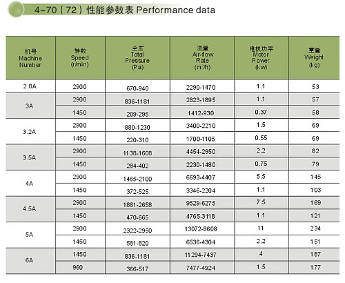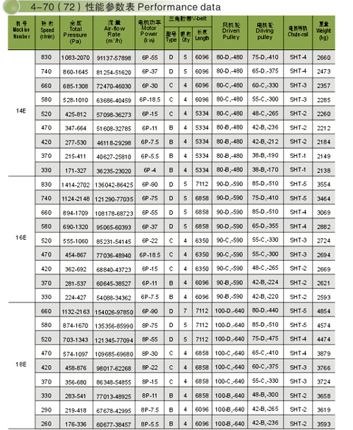 4-79、4-70(72)型离心风机是引进日本ミツヤ公司的先进技术并通过本公司工程技术中心进行吸收、消化、创新研制而成,其性能指标优于我国通用的4-79、4-72型离心通风机。该风机噪声较老式风机低5~8dB(A),外形尺寸也较老式风机紧凑,效率及比A声级优于机械工业部制订的标准。4-70型通风机共15种机号,风量930~154000m3/h,风压170~2950Pa;4-79型通风机共20种机号,风量1100~438000 m3/h,风压230~3320Pa,用户可根据不同参数选择。