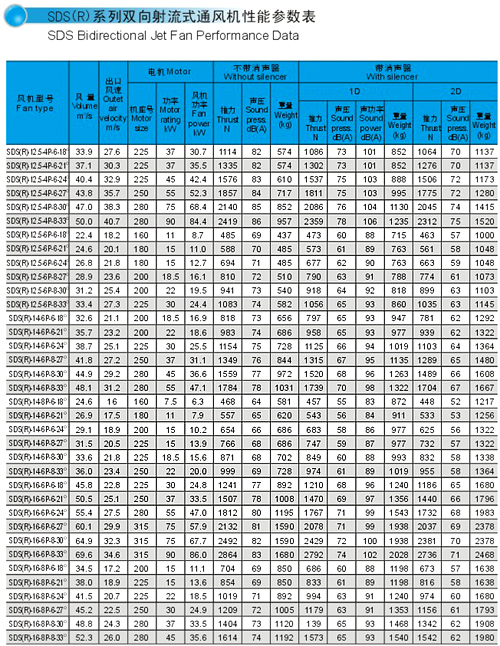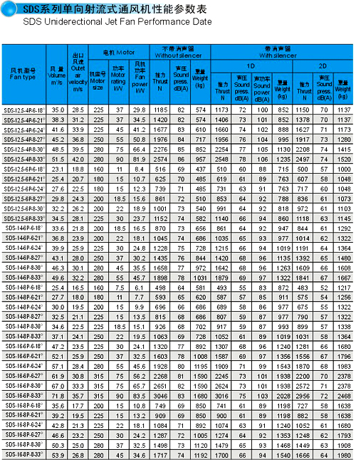 SDS系列射流风机规格自Φ630㎜~Φ1600㎜,分单向运转轴流风机和可逆式(双向)运转轴流风机二大类,最大推力达到3500N,对于绝大部分负荷和工况均可选择此类高效、低噪声风机。
